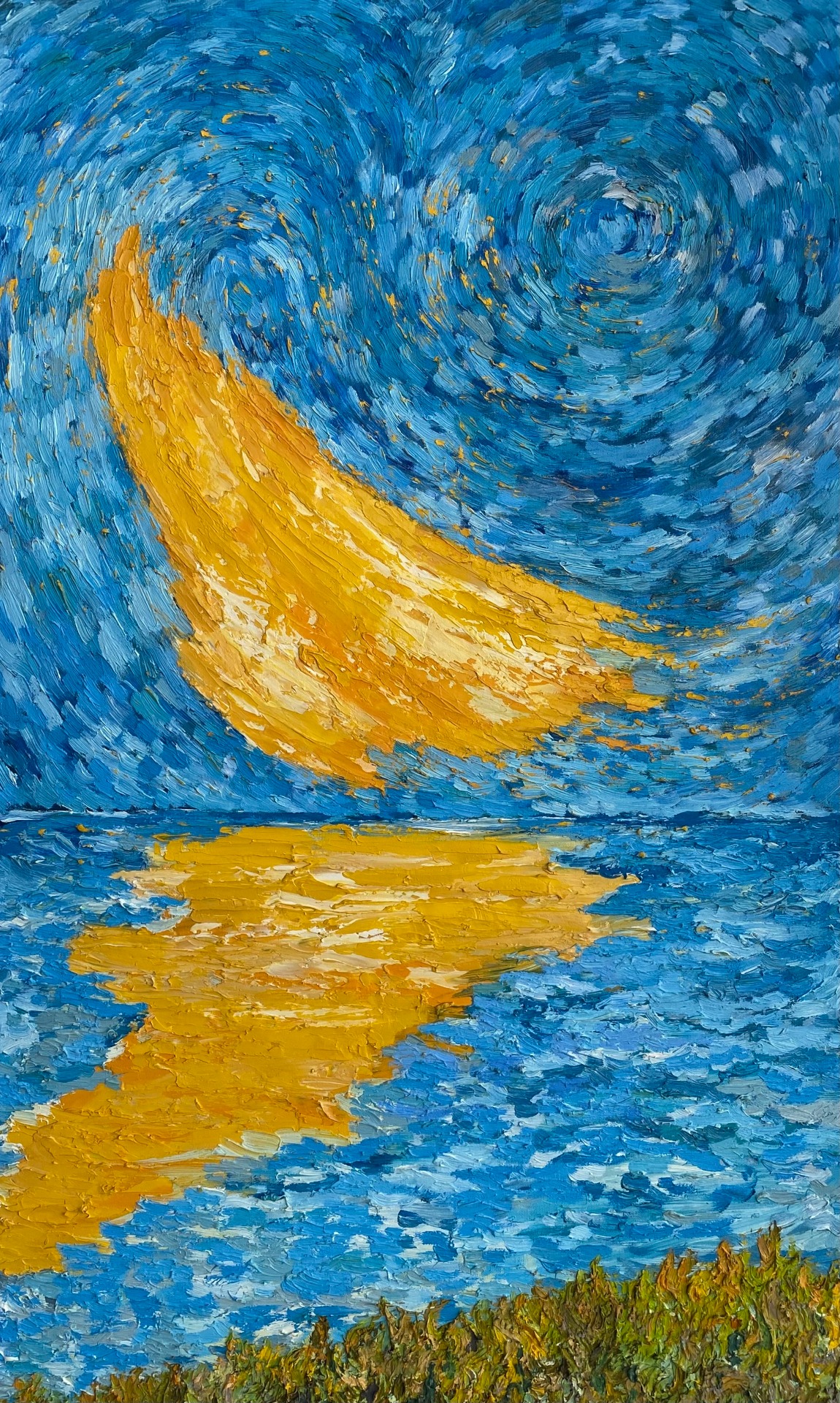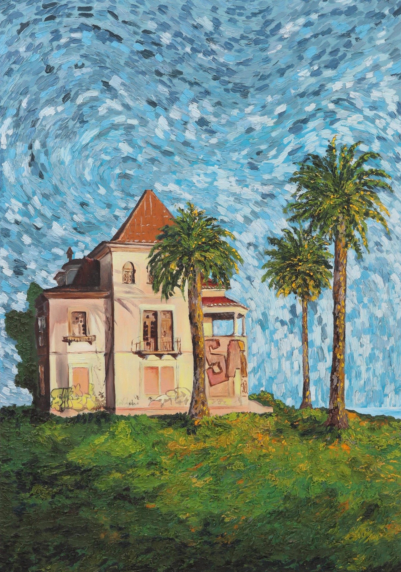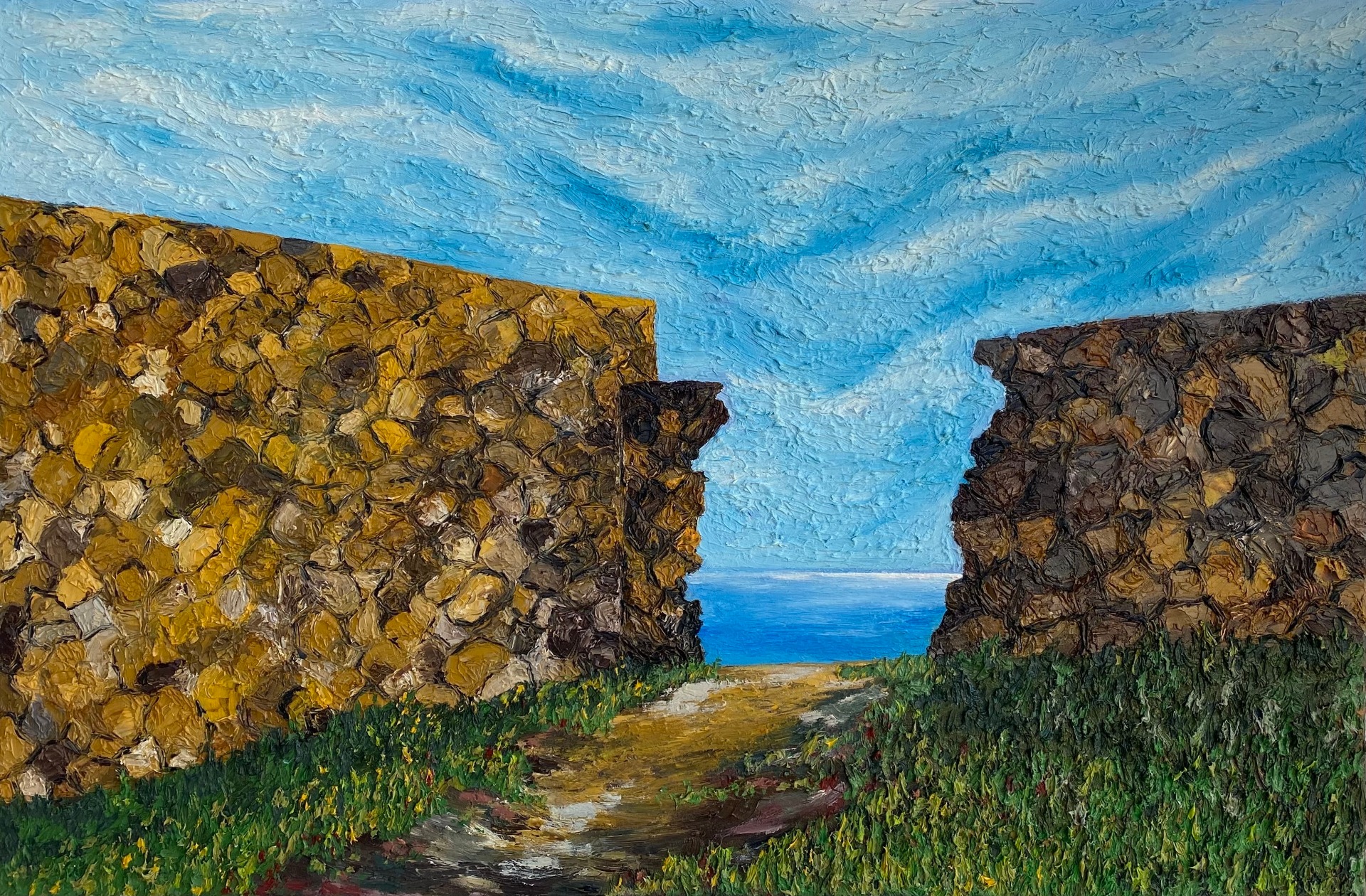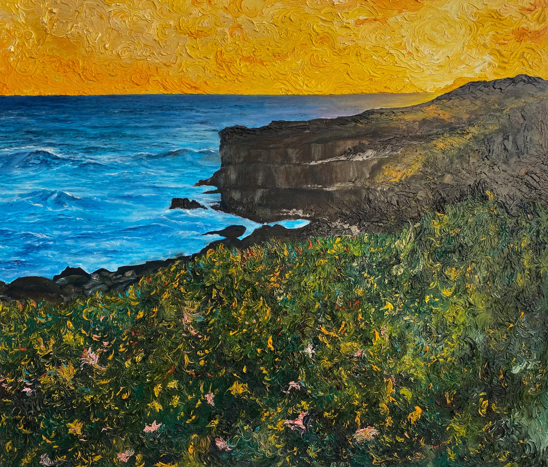 Painting 60x70cm is based on another late afternoon walk along the coast of Guia in Cascais. This painting was created together with my wife, with me in charge of adding volume to the sky and green areas.