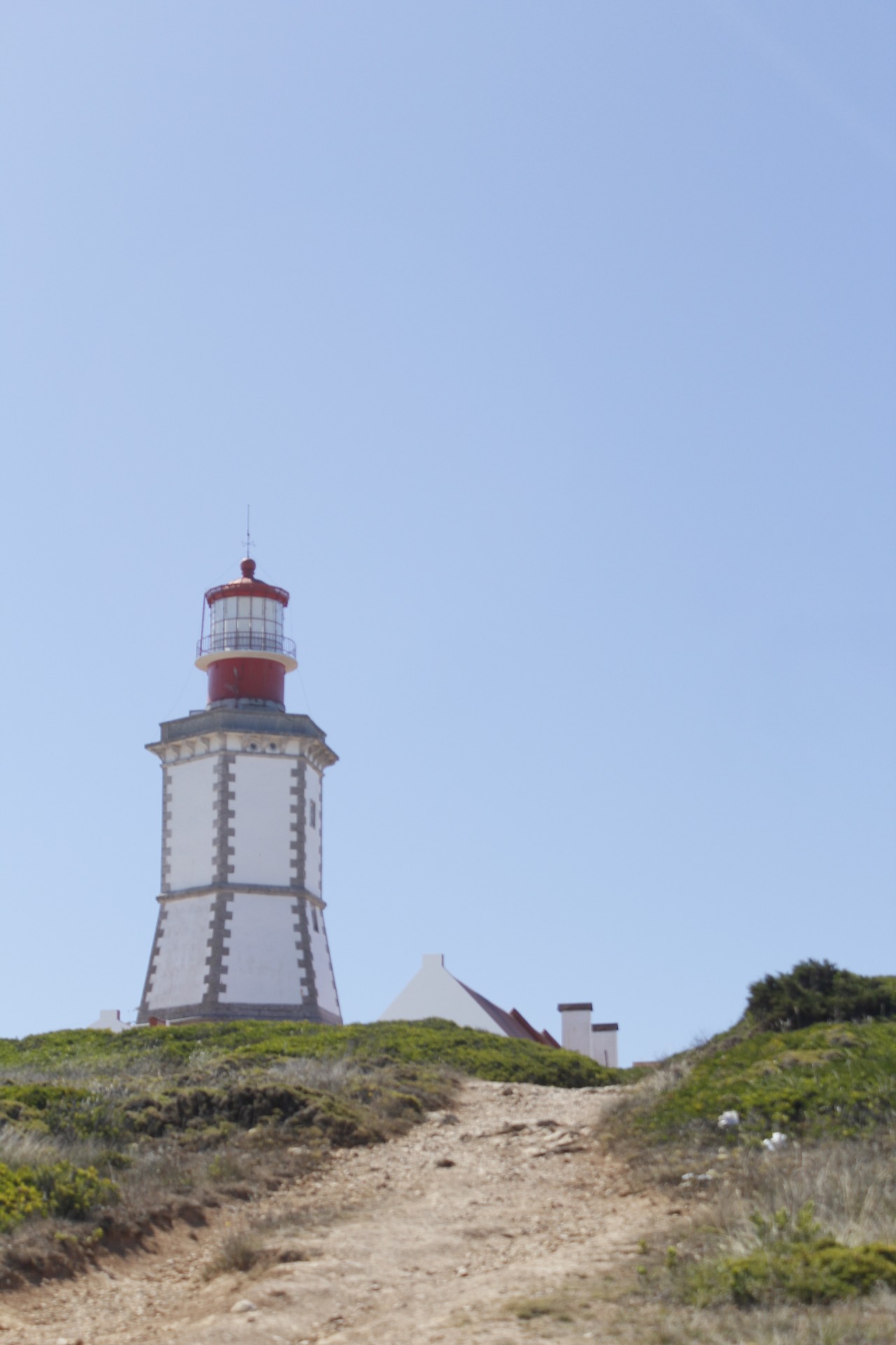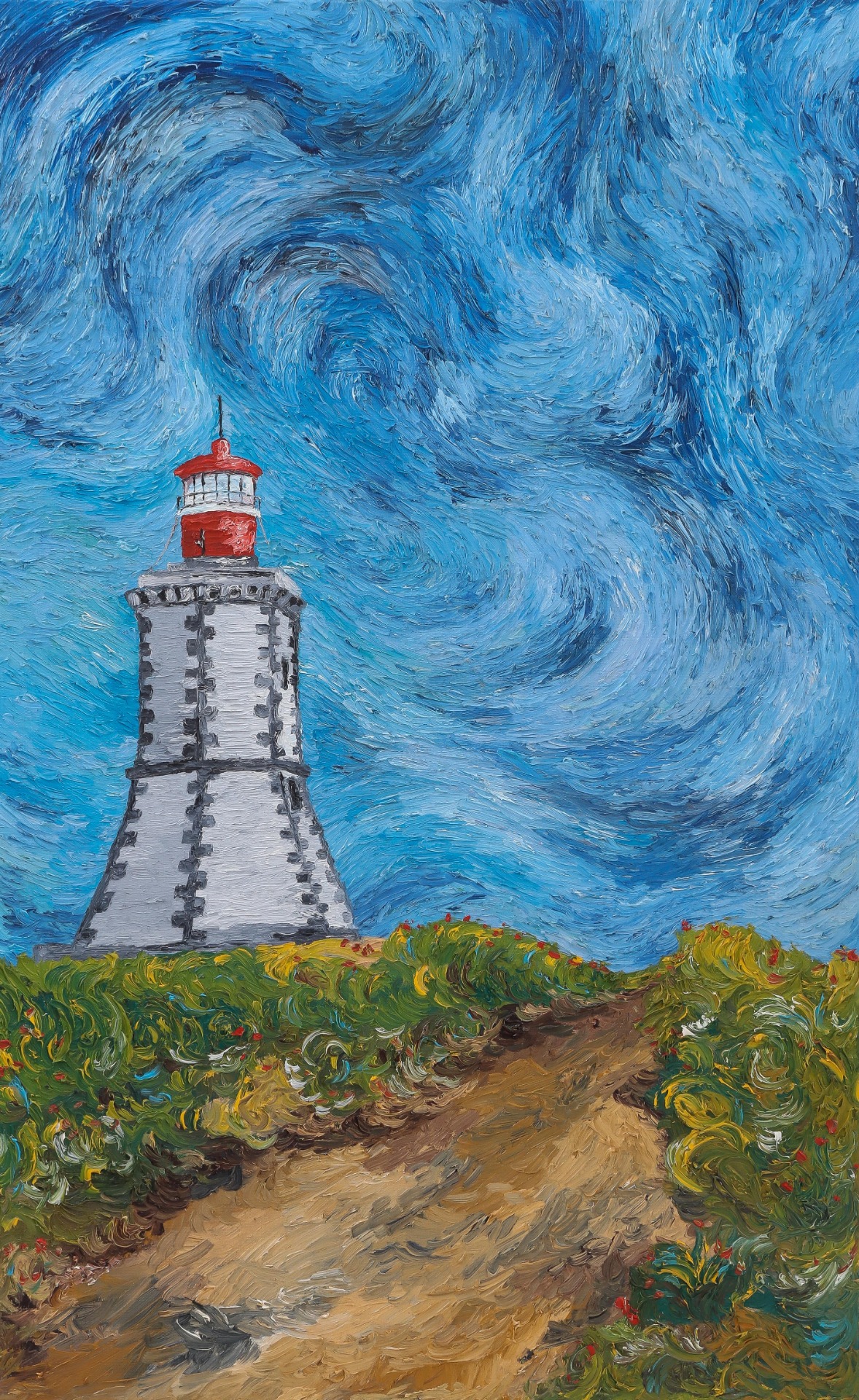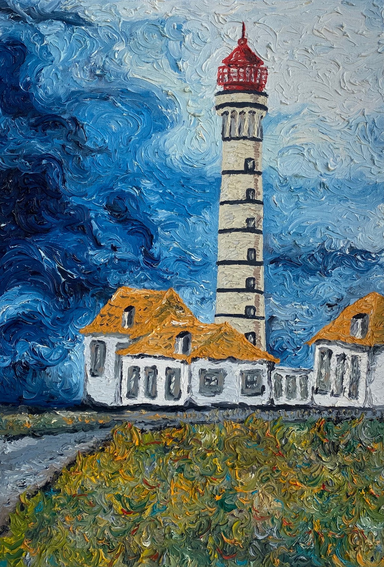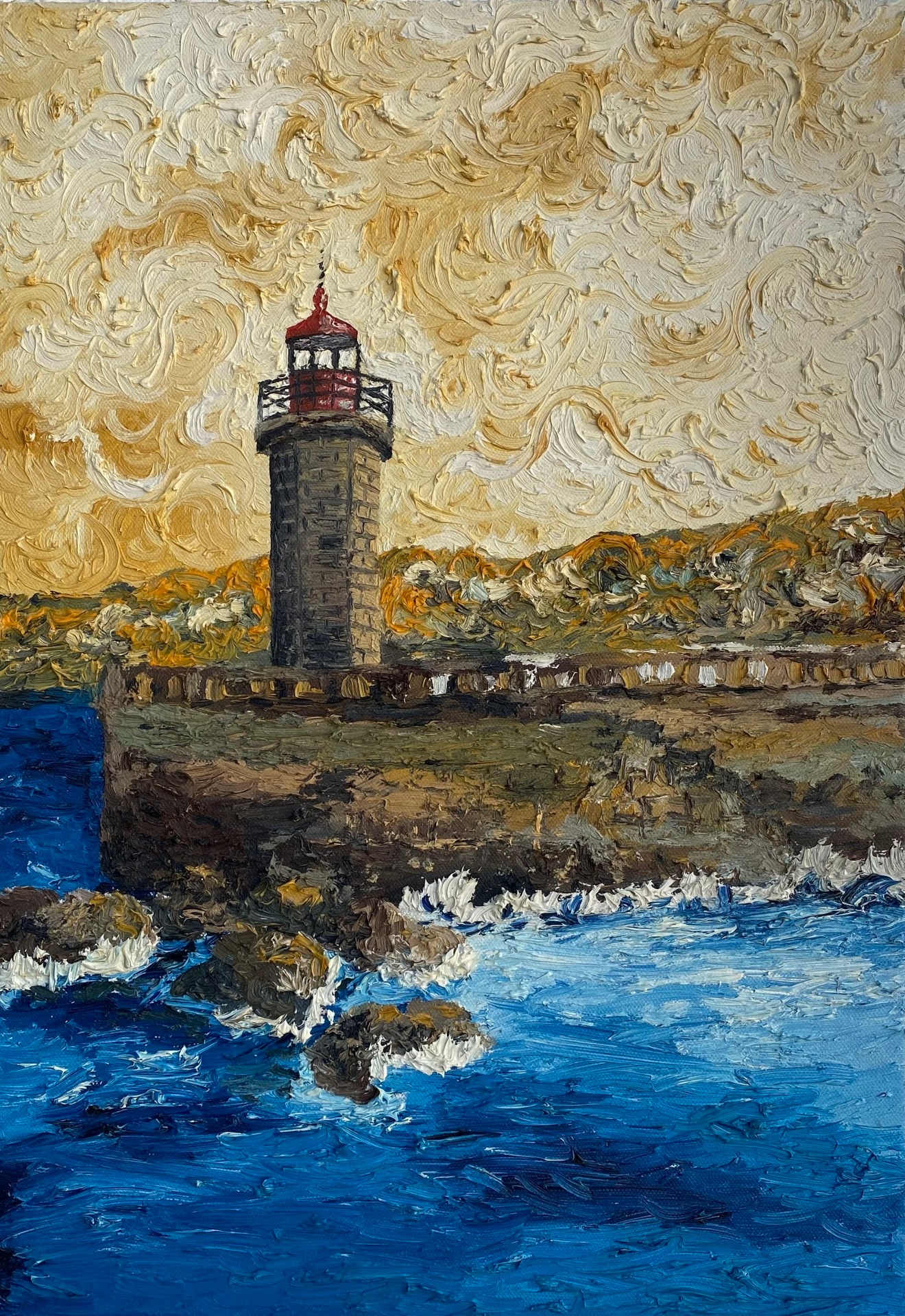 50x80 cm painting based on a photograph of the weekend trip to the coast of Sesimbra, where heaven and earth meet there is always room for a lighthouse to illuminate those traveling at sea, pointed towards the vast Atlantic Ocean at an altitude of 134 meters This is the Cape Espichel lighthouse. Date August 2018