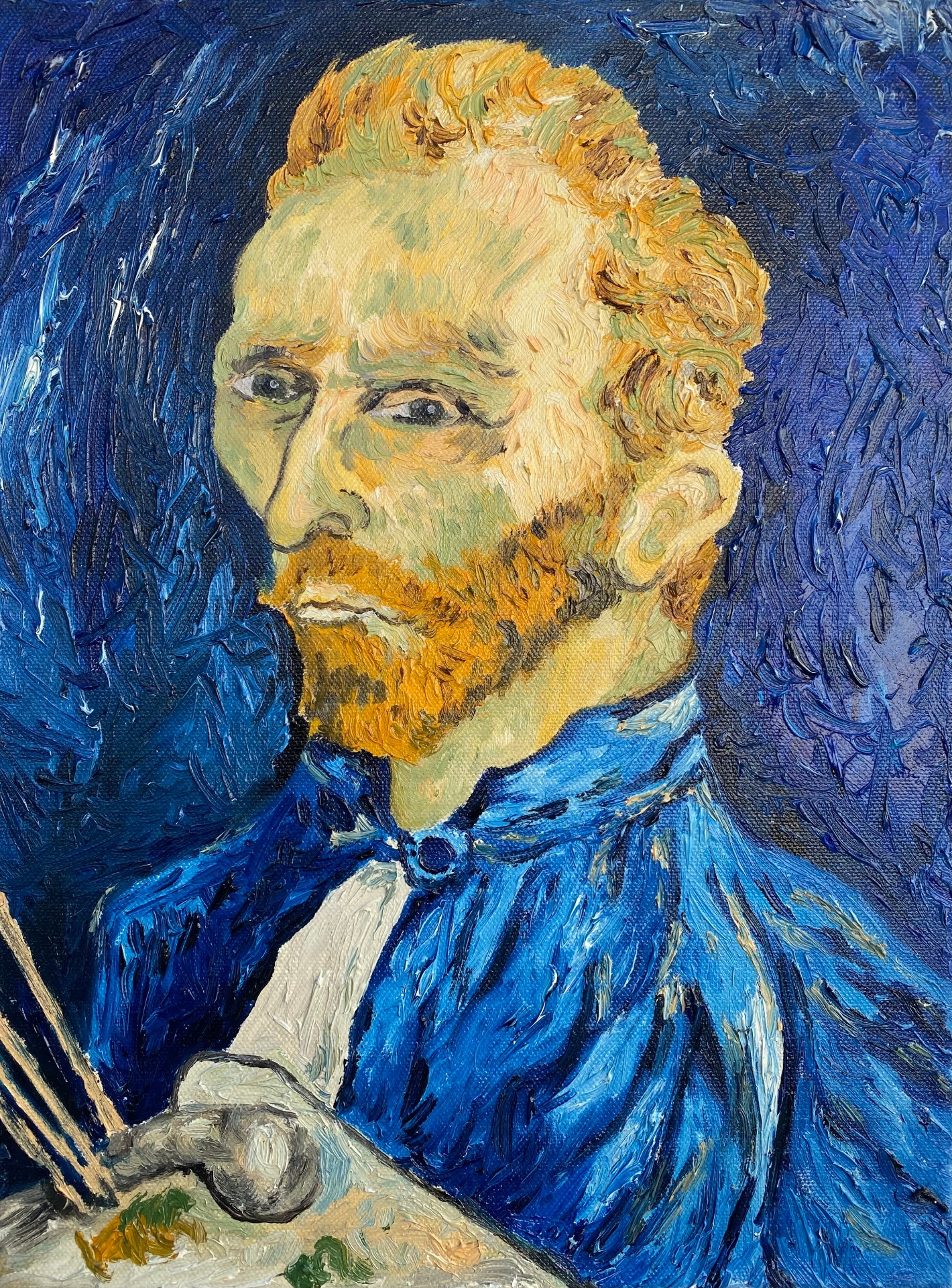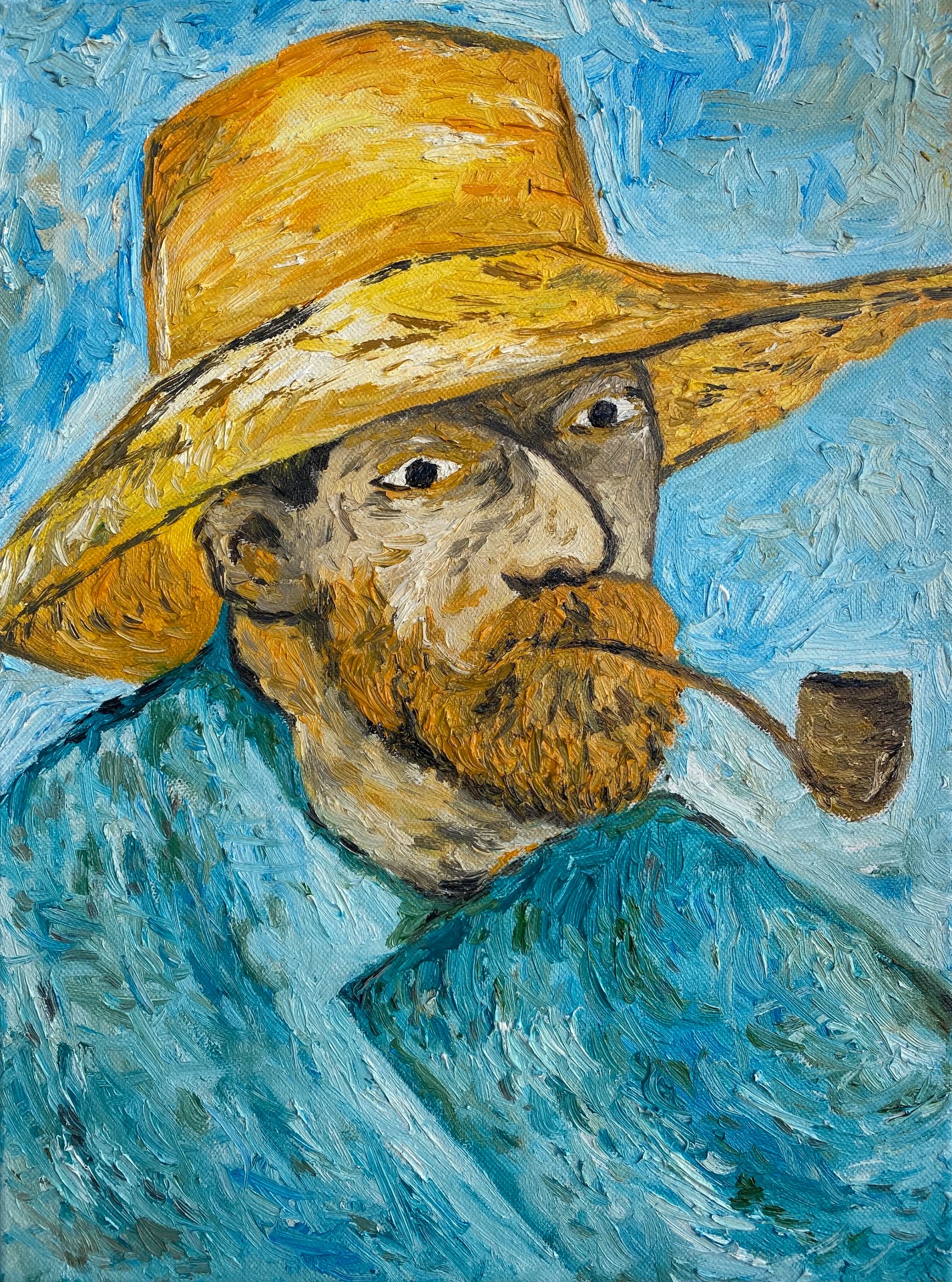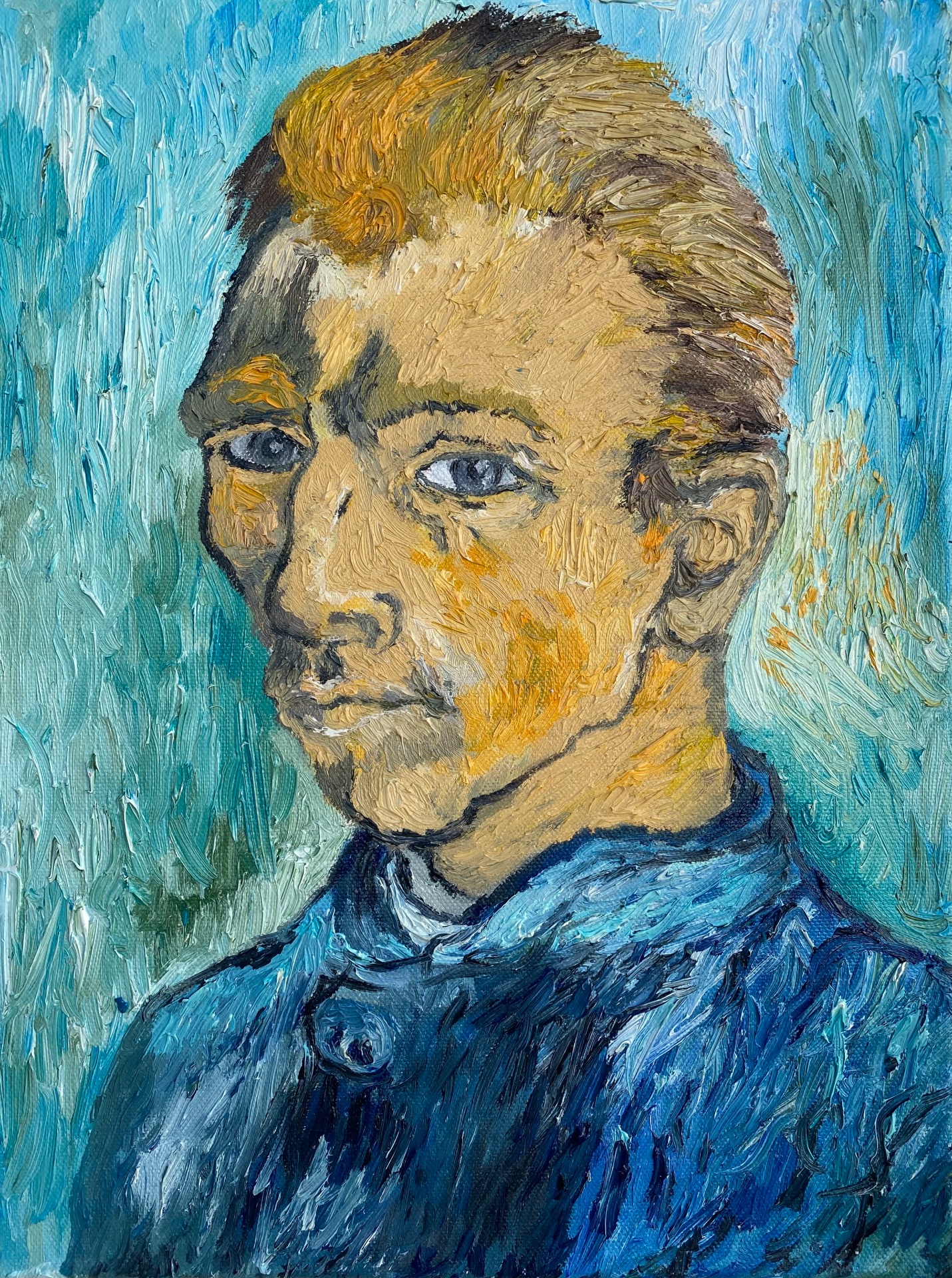 30x40 cm based on Vincent Van Gogh's self-portraits, works that were at the beginning where I was trying to evoke my style of relief lines in oil.