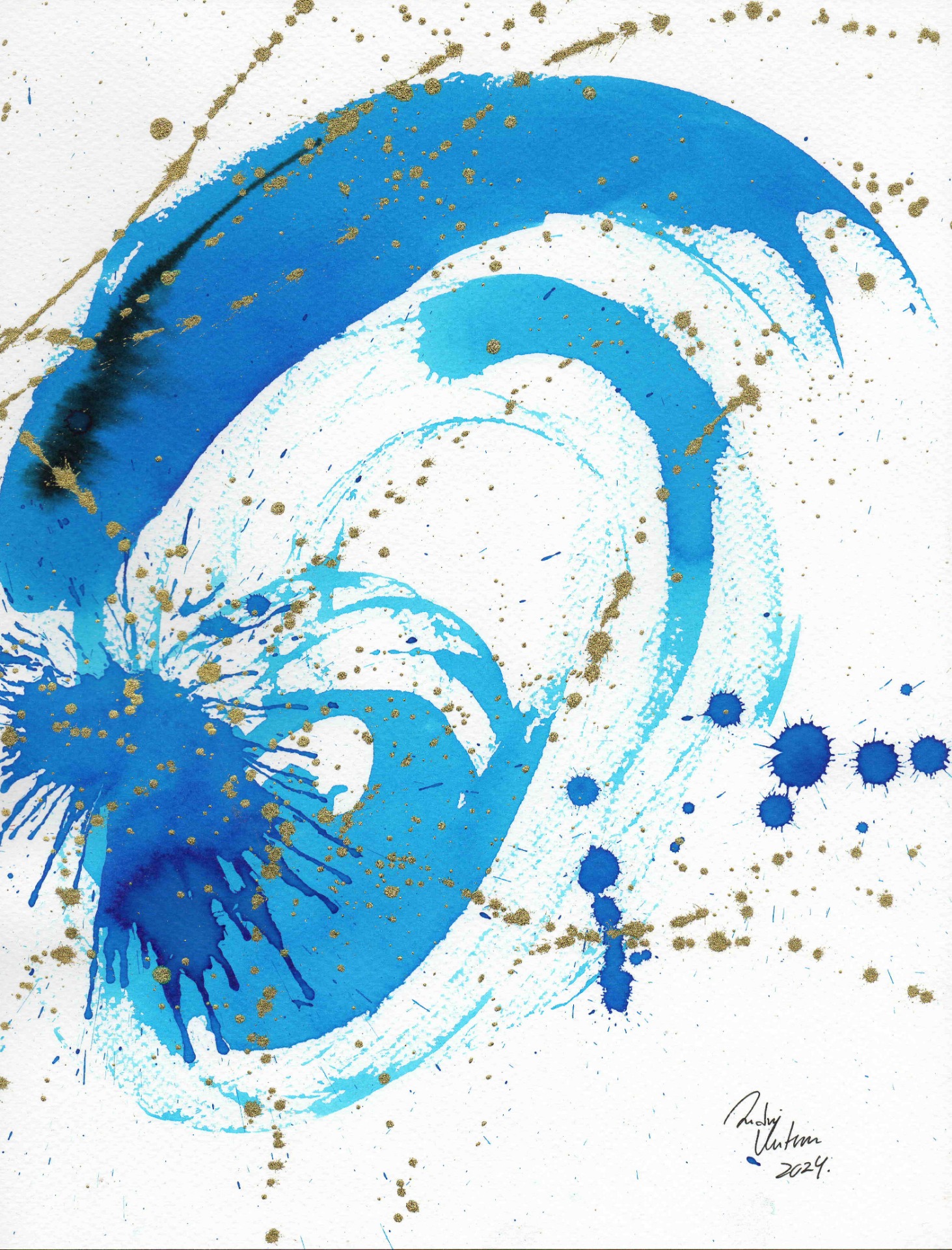 Apresento uma técnica livre abstrato utilizando tintas de aguarela liquida da marca Ecoline sobre um papel Fabriano de 300 gramas finalizando com variadas tintas de acrílico o efeito dourado.